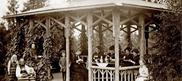 Syntolkning: en grupp med människor står i en danspaviljong i trä, några sitter vid ett bord och fikar.