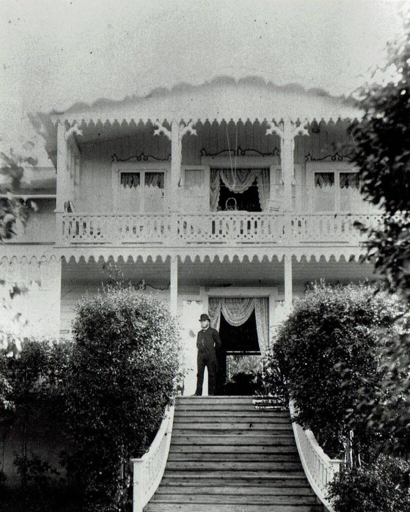 Syntolkning: Ett svartvitt foto över Villa Fridhem, ett stort vitt hus med en lång trappa vid entrén. På verandan framför huset står en finklädd man i hög hatt.